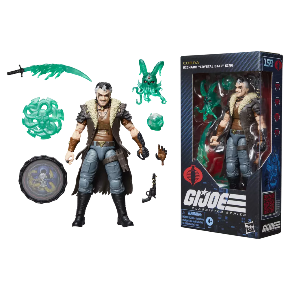 G.I. Joe is a highly skilled, on-demand, special operations force of men and women from around the globe tasked with defending the world from Cobra, a ruthless criminal organization bent on total domination. The brave members of G.I. Joe are prepared to seek out Cobra in any environment on the planet. From hostile jungles to ice-clad arctic peaks…wherever there’s trouble, G.I. Joe is there. New to the G.I. Joe Classified Series line, Richard ""Crystal Ball"" King comes ready for adventure, with multiple points of articulation for high poseability. This Richard ""Crystal Ball"" King figure contains 8 character-inspired accessory pieces including an alternate hand, D.I.R.E. (Dread-Inducing Responsive Energy) Tech-projected monster mask, lenticular hypno-shield with attachable fear manifestation, spectrally-charged sword, crystal ball with ghostly tendrils, and a weapon accessory. G.I. JOE and HASBRO and all related trademarks and logos are trademarks of Hasbro, Inc.