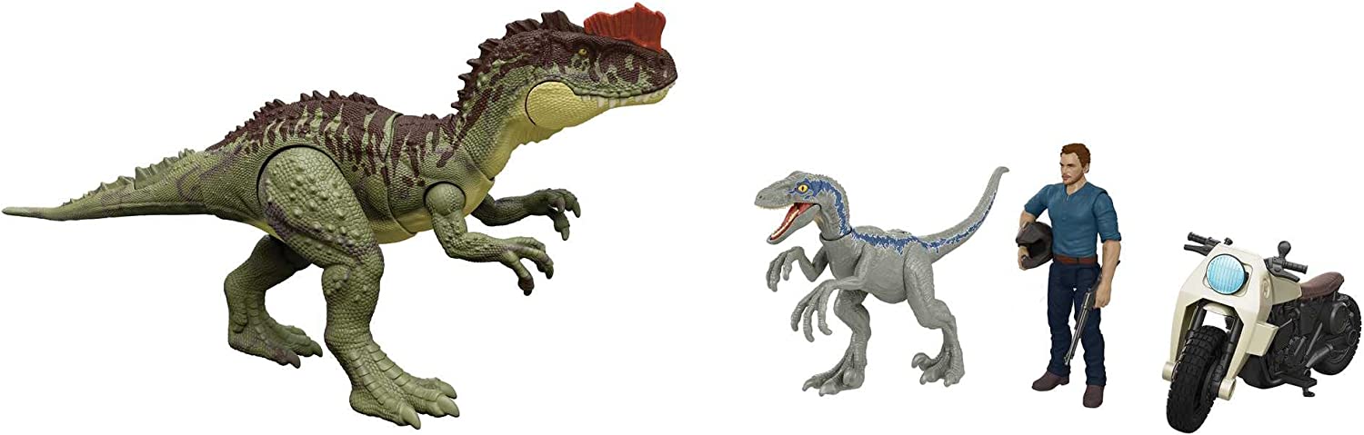• Find a motorcycle with exclusive decoration and rolling wheels, the Owen Grade figure with movable joints and removable helmet, Yangchuanosaurus and Blue posable dinosaur figures and a tranquilizer blaster!