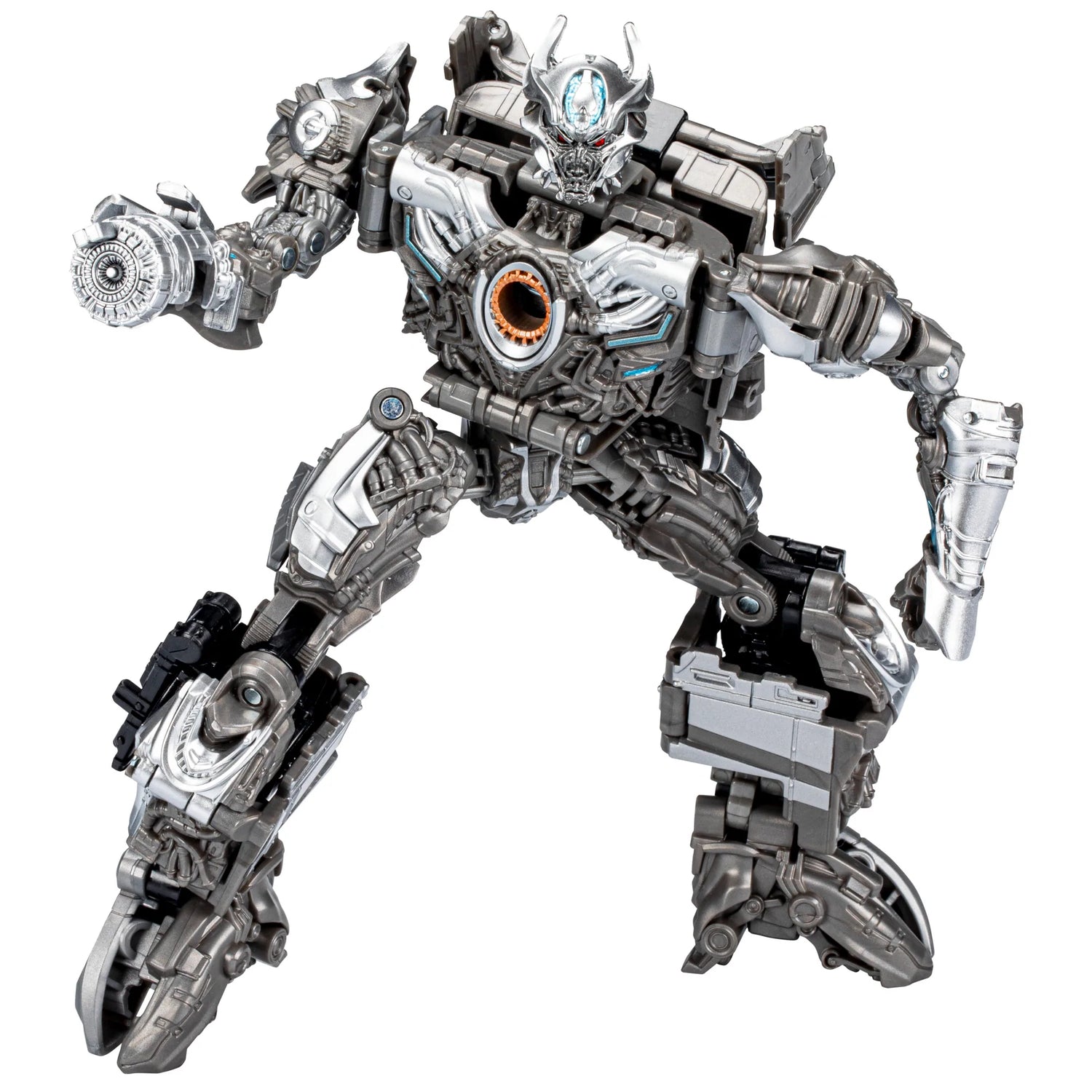 This Studio Series 90 Voyager Class Transformers: Age of Extinction-inspired Galvatron figure converts from robot to Argosy truck mode in 30 steps. Remove backdrop to showcase Galvatron in the Hong Kong Pursuit scene. In the Hong Kong Pursuit scene from Transformers: Age of Extinction, Galvatron leads the KSI Decepticons into Hong Kong to gain control of the seed. Pose the figure out with the included arm-mounted cannon accessory and imagine re-creating this classic movie moment!