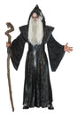 The power of the universe at my hands! The Dark Wizard is a 2 layered costume with belt. The inner layer is a robe with flared sleeves. The outer layer is a cloak with attached hood made of a distressed black fabric with studded foam trim. The belt piece comes with an attached dragon emblem.