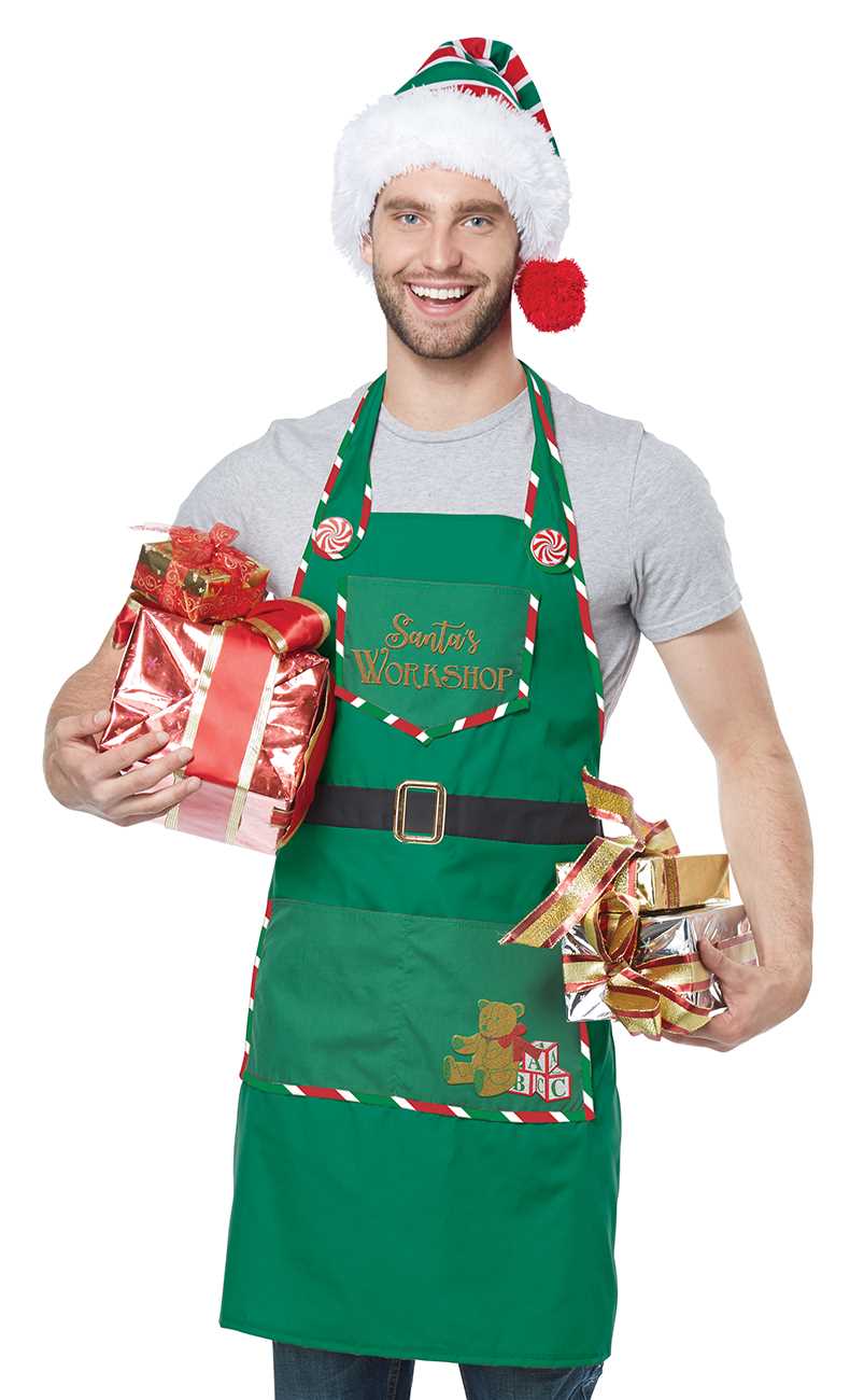 It's all work and all play right on time to make presents for Christmas! The Santa's Workshop Apron set is a cotton apron with a striped hat. It features one top pocket and a lower partitioned pocket. It is decorated with embroidered text, a pair of peppermint buttons, a sewn on belt with buckle and a toy print graphic. Don't forget to help Mrs. Claus with her baking!