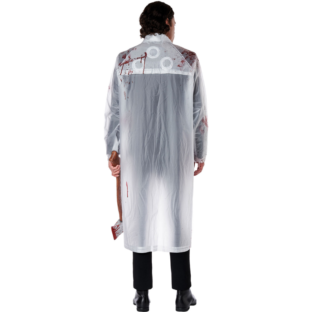 Channel your inner '80s horror icon with this Yuppie Psycho Killer costume. Inspired by cinematic thrillers, this translucent raincoat with blood-splatter effect is perfect for Halloween parties or any event where a chillingly stylish entrance is desired.
