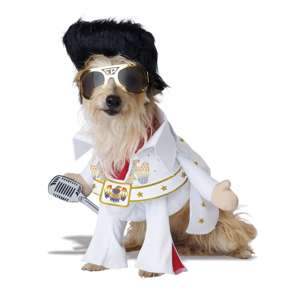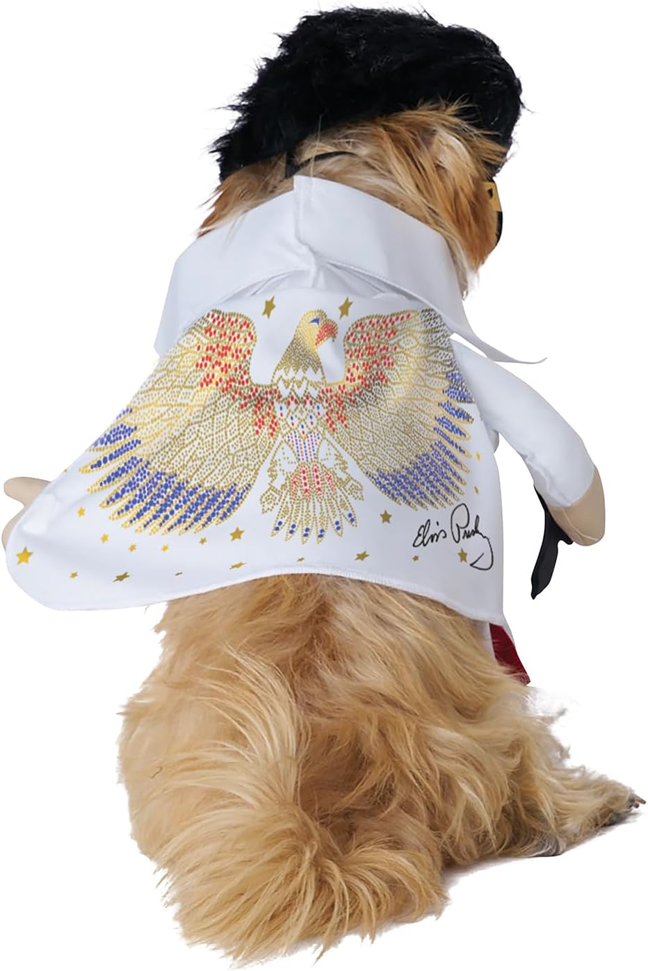 Designed after Elvis’ iconic American eagle jumpsuit, this pet costume will make your pal a Rock n’ Roll King. This costume includes a one-piece jumpsuit with attached arms and belt. It comes with a wig headpiece, set of faux glasses, a cape, a scarf, and a foam microphone. The costume closes in the back, cape attaches with hook and loop fastener. Plastic faux glasses attach to wig. Wig worn with elastic chinstrap. Foam microphone attaches to costume hand.
