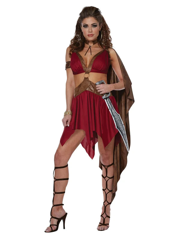 Stunning and powerful the goddess is ready to lay siege upon the realms of evil! The Warrior goddess costume is a dark red dress with a detachable brown faux leather cape. The dress top features a deep v-neckline, while the bottom skirt is in a handkerchief style. The two pieces are connected by faux leather trim with metal ring. The costume is accessorized with a chocker and (1) one armband with gold colored rings.