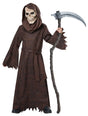 Gather lost souls and show them the way. The Ancient Reaper child costume is a long textured robe with an attached hood. It comes with a waist tie and skull mask. Shoes and scythe not included.