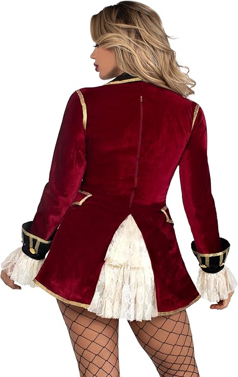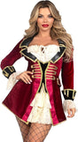 Set sail for adventure with the Captivating Pirate Captain costume! This stunning velvet jacket dress features a tie-front bodice and delicate lace ruffle accents. Perfect for any swashbuckling occasion, just add your own hat and sword for a complete look. (Sword and hat not included)