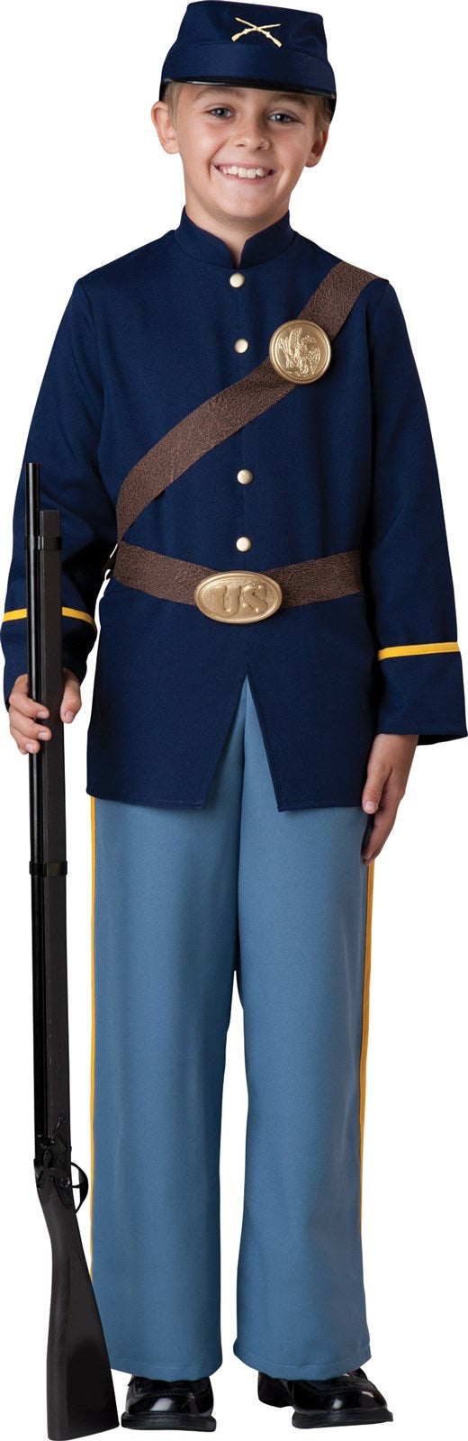 Join the battle in style with our Civil War Soldier child costume! This costume includes a jumpsuit with detachable belt and buckle, shoulder strap with detachable buckle, and a matching hat. Perfect for playtime or Halloween, it's a must-have for any aspiring soldier.