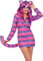 Cozy Cheshire cat, features striped zipper front fleece dress with cat ear hood and mischievous long tail.