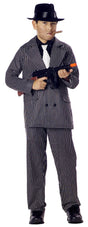 Includes a poly/cotton woven black and white pinstripe jacket, matching pants and a black dickey with white tie. Available in child size Medium and Large. Hat sold separately. Machine gun, cigar and shoes not included.