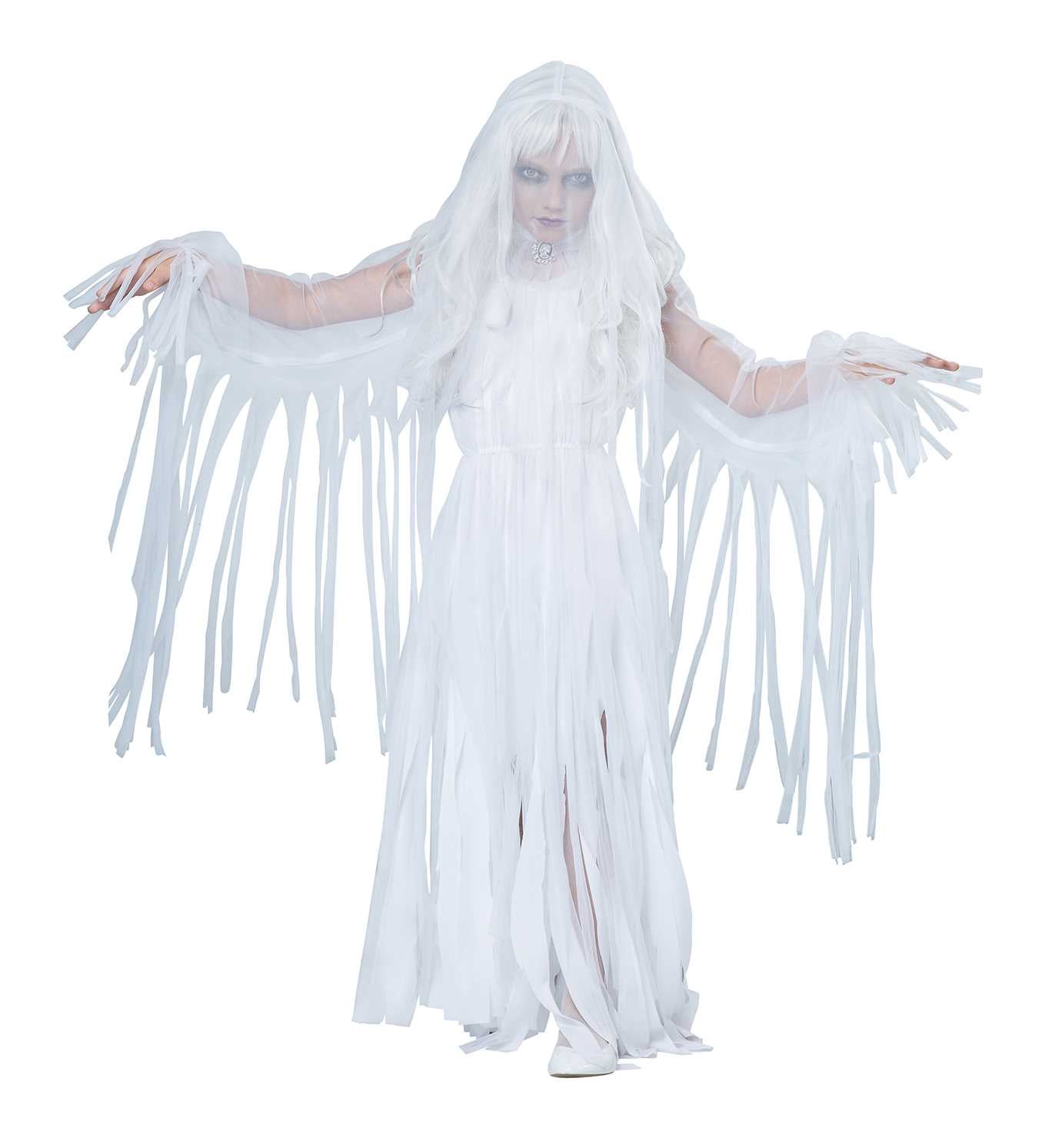 Do you feel a ghostly chill in the air? The Ghostly Girl child costume comes with a mesh overdress, a white under dress and a brooch. The overdress features flowing fabric strip sleeves and a detachable hood. Shoes not included.