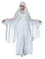 An unforgettable specter from the underworld. The ghostly spirit costume comes with a white dress and a sheer overdress. The overdress features flowing fabric strip sleeves and a detachable hood also featuring a brooch.