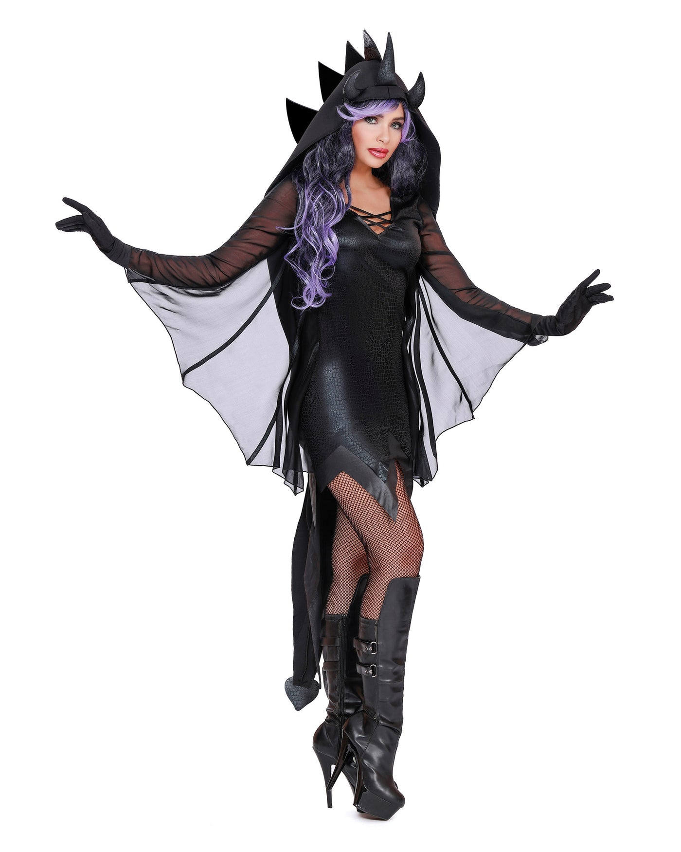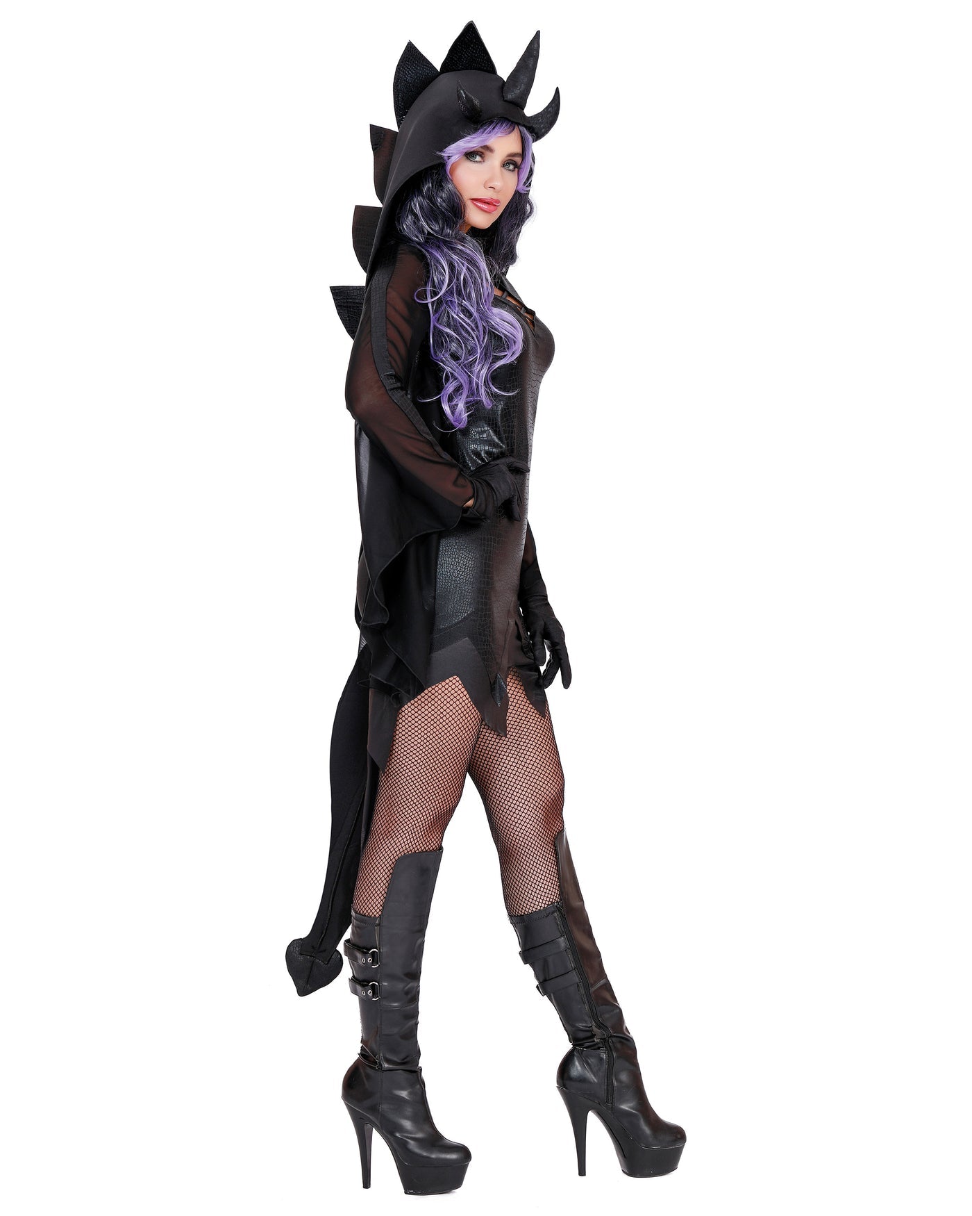 Darling dragon costume includes a reptile printed dress with sheer webbed sleeves. Pairs beautifully with any Queen costume!