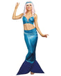 - Brilliant blue holographic-print mermaid skirt with three strands of faux-pearls, contrast fish tail and back slit.