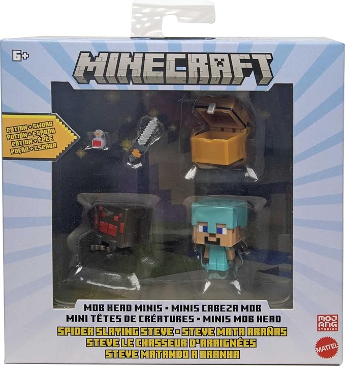 - The re-designed, Minecraft Mob Head Mini Steve and Spider action figures are styled with giant heads.