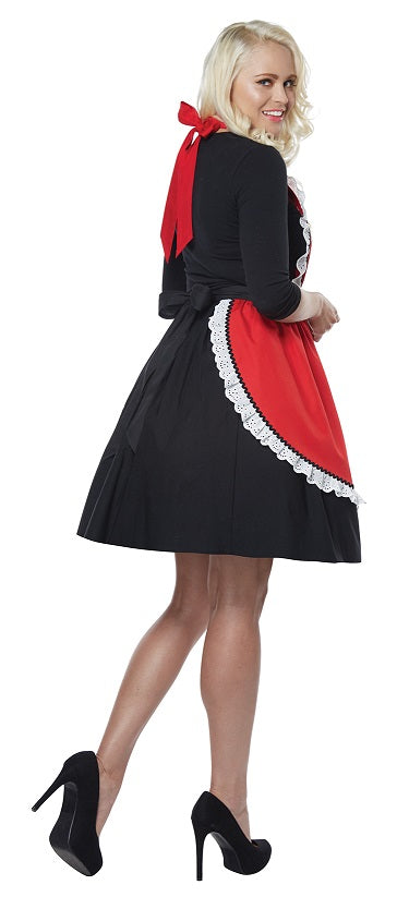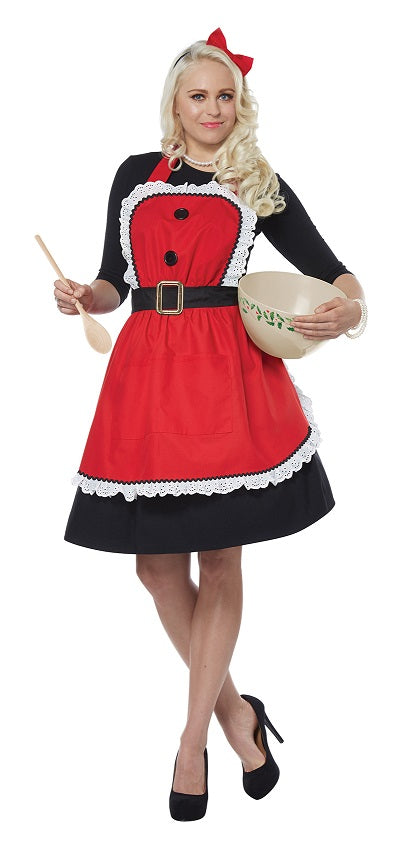 Look out for Santa since it's the merriest time of the year, Christmas! Perfect for baking those gingerbread cookies and cooking a holiday feast! The Mrs. Claus Apron set is a cotton apron with headband bow. It is decorated with white ruffle trim, a set of buttons and sewn on belt with buckle. The apron pocket is partitioned into two.