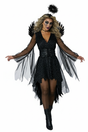 Black dress with a sequin mesh fabric over layers. The mesh fabric forms flared sleeves with extra fabric attached at the lower portion to help create a flowing ethereal feel. Also features a high low skirt. Corset styled piece is lace up. Embossed wings worn with elastic shoulder straps. Headband with attached black tinsel Halo. Unleash your dark side in this shimmering dark angel costume. A black dress with sequin mesh overlay and dramatic draped sleeves. It comes with a set of embossed wings, a daring lace-up corset styled piece