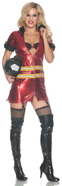 Costume includes dress, bandeau bra, and firefighter hat; shoes and fishnet stocking available separately