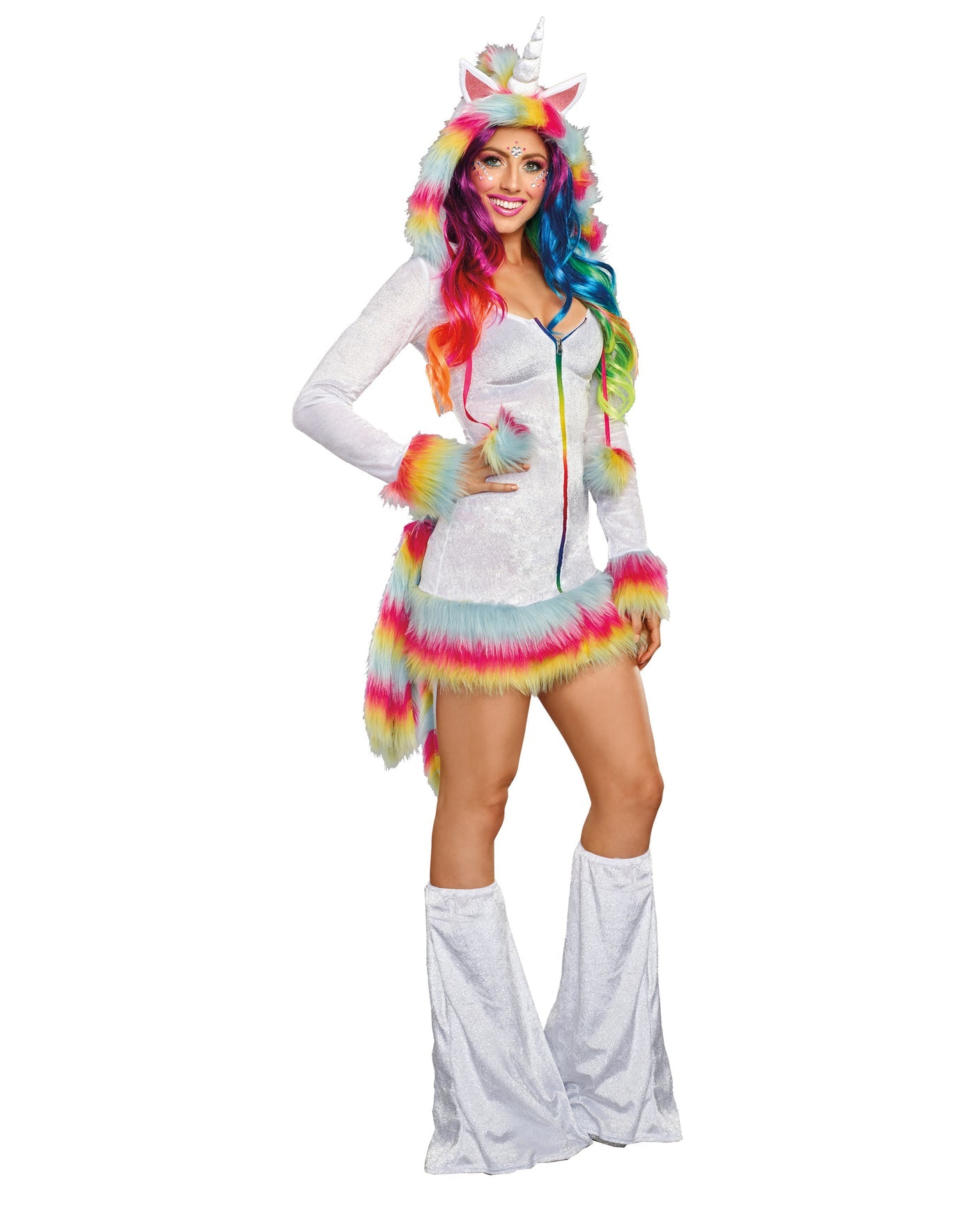 She eats rainbow candy for breakfast and lives life without a care. Her only job is spreading magic everywhere. This enchanting costume includes sparkle-printed white stretch velvet zipper-front dress with rainbow faux-fur trim, attached tail, and hood with unicorn horn & ears.
