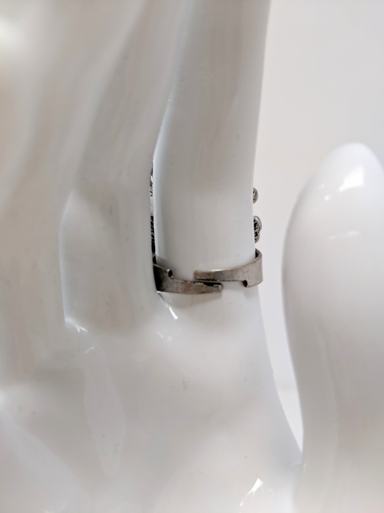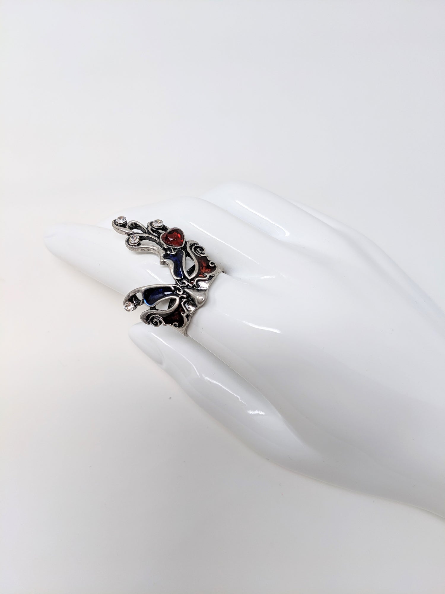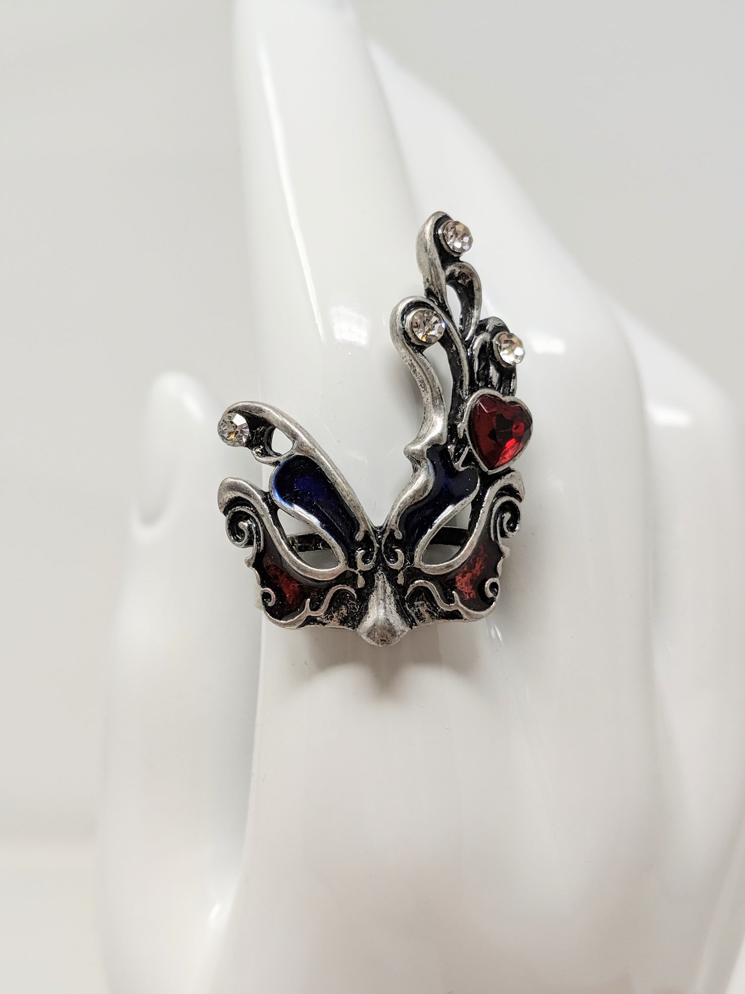 The Wicked Gems Venetian Ring is an intricately designed faux piece of premium jewelry. This adjustable ring features a silver look made to look like an elaborate Venetian Mask with four rhinestones.