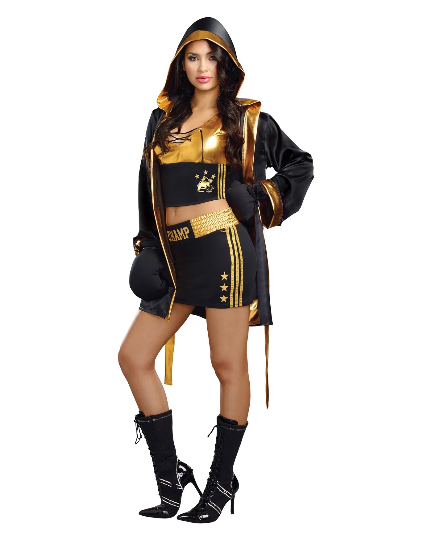 Dreamgirl proudly presents the World Champion Costume for women featuring a black satin robe with gold accents, a gold championship belt, & a black string lace up top. This costume also features a cute champ skirt & costume boxing gloves to complete your Dreamgirl transformation.